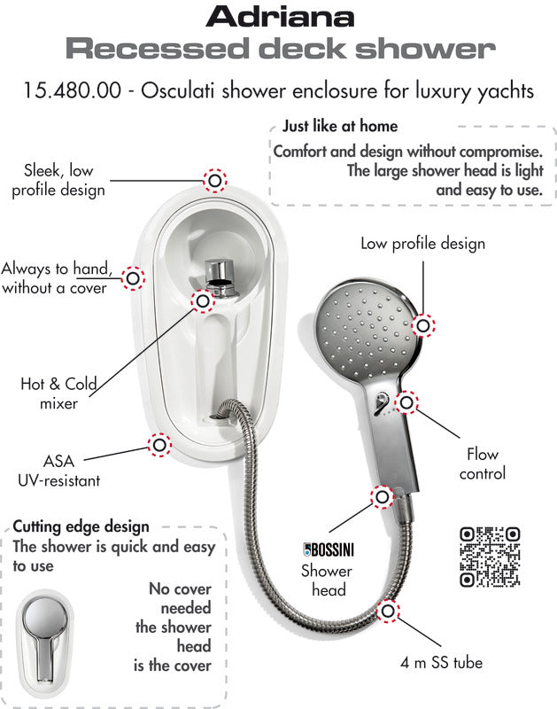 Box doccia deluxe per imbarcazioni di pregio. Dotato di una grande doccia “Bossini” con getto regolabile e miscelatore acqua calda e fredda. Vano in ASA resistente ai raggi UV. L’estrazione della doccia è immediata ed il soffione funziona da copertura. L’assenza di sportello facilita l’utilizzo all’utente ed evita il possibile incastro con il tubo in utilizzo e la rottura dello stesso.