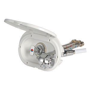 Doccia in plastica cromata, vano di alloggiamento bianco in ASA UV resistente. Completo di rubinetto miscelatore acqua calda/fredda. Montaggio in piano o a parete.