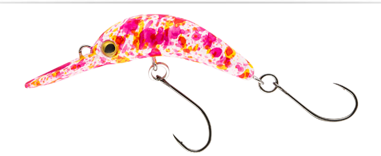 Allora facciamo un lancio con un artificiale diverso, in grado di spostare una massa d’acqua superiore e attivare così le terminazioni nervose della linea laterale, che nella Trota sono molto sensibili. Proviamo un Diavel, il mini crank disegnato appositamente per le situazioni di pesca tipiche della Trout Area: acque limpide e poco profonde, distanze non eccessive, pesci nervosi perché sentono la presenza di troppi pescatori sulla sponda del lago. Con le sue frenetiche oscillazioni e la sua capacità di sondare l’acqua fino a 2 metri di profondità, questo artificiale fa la differenza; se poi consideriamo la gamma di colori disponibili, con le fantastiche versioni “cluster” dalle tinte casuali, abbiamo un’idea di quante opzioni possiamo proporre ai pesci. Di rigore gli ami singoli Powerpoint senza ardiglione, caratterizzati dalla punta 3D Cut.