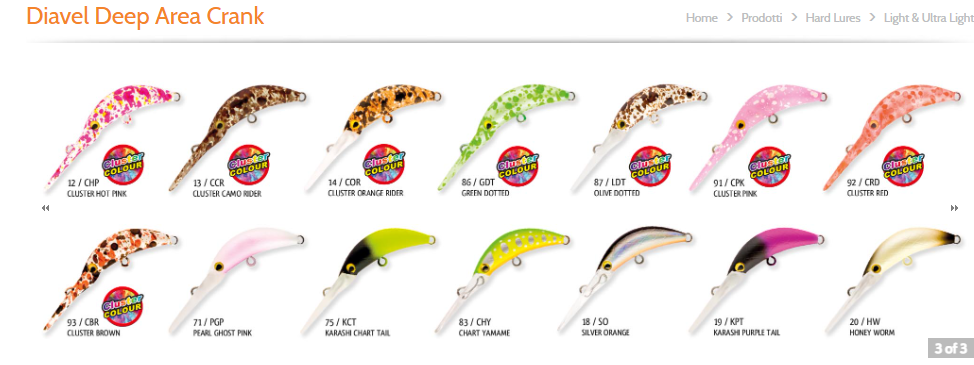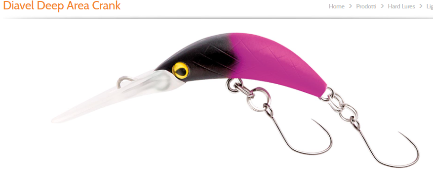 In effetti, la grande superficie della paletta e la posizione dell’anellino di collegamento alla lenza fanno affondare il Diavel Deep rapidamente, dopo l’impatto con l’acqua, e gli fanno mantenere una batimetrica di nuoto che, nella maggioranza dei laghetti da Area, corrisponde alla totale profondità. La sagoma molto arcuata e la schiena larga lo fanno oscillare freneticamente anche ai bassi regimi di recupero, dando il tempo alla Trota svogliata di fermarlo senza sprecare troppe energie. La gamma dei colori spazia dai toni molto chiari a quelli molto scuri, consentendo di optare per il contrasto o per l’allineamento, rispetto ai colori dell’ambiente o all’intensità dell’illuminazione. Ben otto sono i colori Cluster, cioè realizzati a spruzzo per ottenere completa casualità. Gli ami singoli senza ardiglione sono di classe 3D Cut Powerpoint.