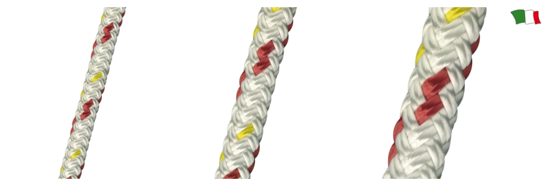 Doppia treccia a 16 fusi in fibra 100% poliestere alta tenacità con anima interna intrecciata in fibra di poliestere alta tenacità (lavorazione SAG).
