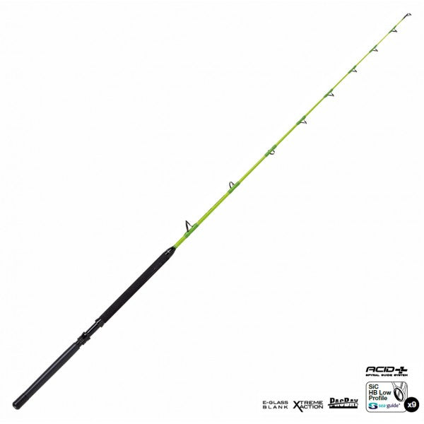 Nella mitologia antica, Zaratan era un mostro marino. Oggi è una fantastica serie di canne progettata per il trolling e il drifting. Caratterizzate da un look particolarmente attraente, basato su colorazioni accese tono su tono, le Zaratan nascono da una tecnologia costruttiva e di allestimento senza compromessi. Il grezzo è realizzato in monopezzo di E-Glass per una resistenza totale, garantendo flessioni estreme in combattimento e presentando un deciso movimento di rientro del fusto durante il pompaggio del pesce. Questo “rientro automatico” stanca il pesce e preserva la schiena dell’angler anche quando pesca i grossi tonni in stand up con lenze trecciate. Gli anelli sono Sea Guide Heavy Duty, con telaio in acciaio inox e passante in SiC, fissati da doppie legature secondo il concetto Acid Spiral Wrapping, che impedisce alla lenza di entrare in contatto con il fusto della canna quando esso è piegato drasticamente. Il portamulinello è in alluminio e presenta una doppia ghiera di sicurezza. L’impugnatura in EVA offre una fore grip a densità differenziata, mentre la base ha la finitura slick e termina con la classica crociera in alluminio.